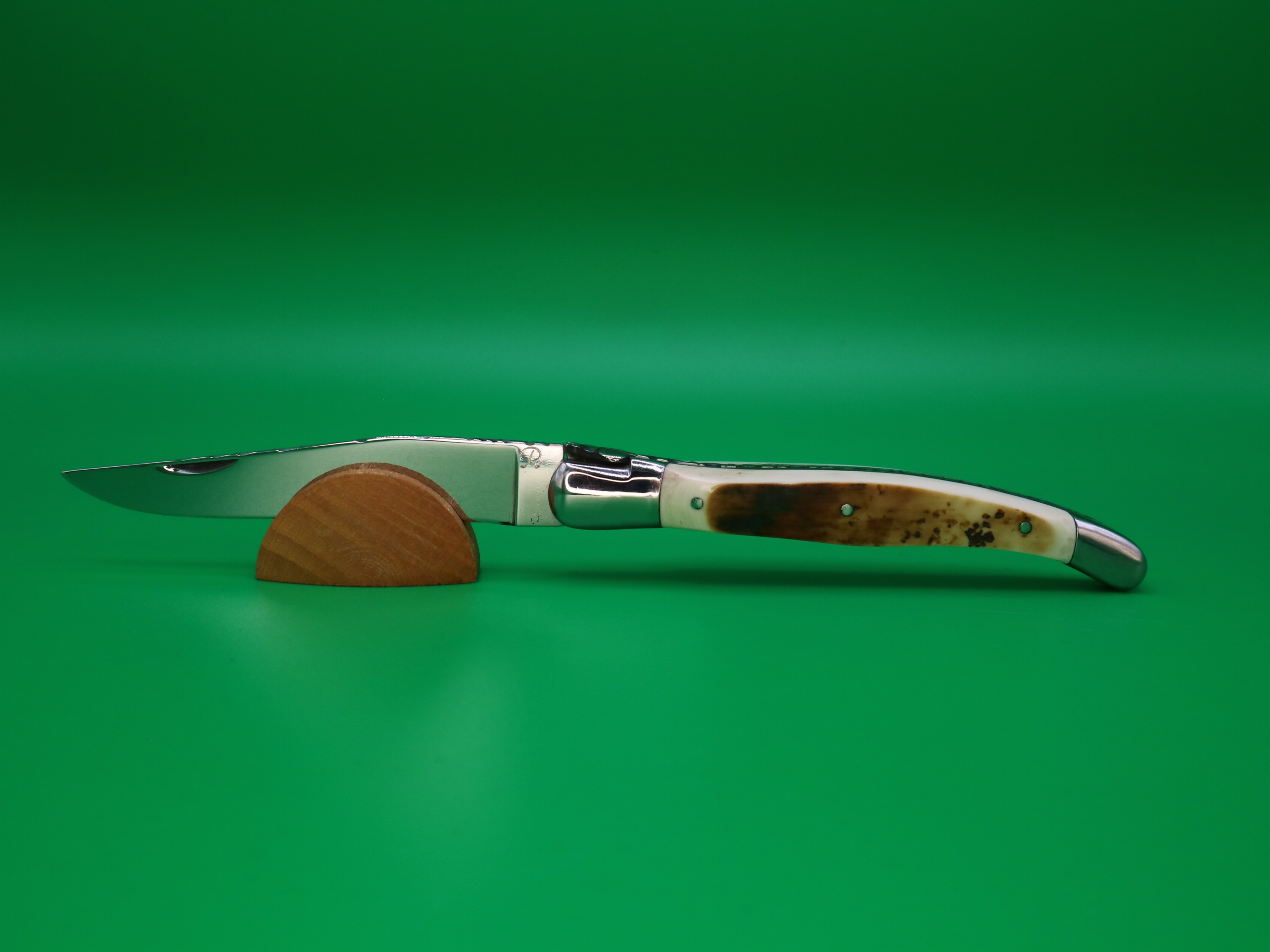 Couteau artisanal lame inox 12C27 avec guillochage fait main sur le ressort, la lame et l’intérieur avec Mouche Forgée.